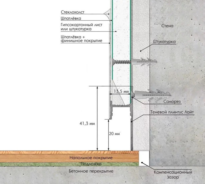 • Тип плинтуса: прямой, узкий, с подсветкой, скрытого монтажа